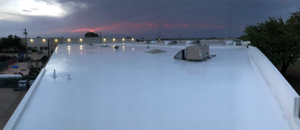 Installation of a silicone roof over a TPO roof. Call I-35 Roofing (800) 411-3354 for a Cost Effective Roof Solution.